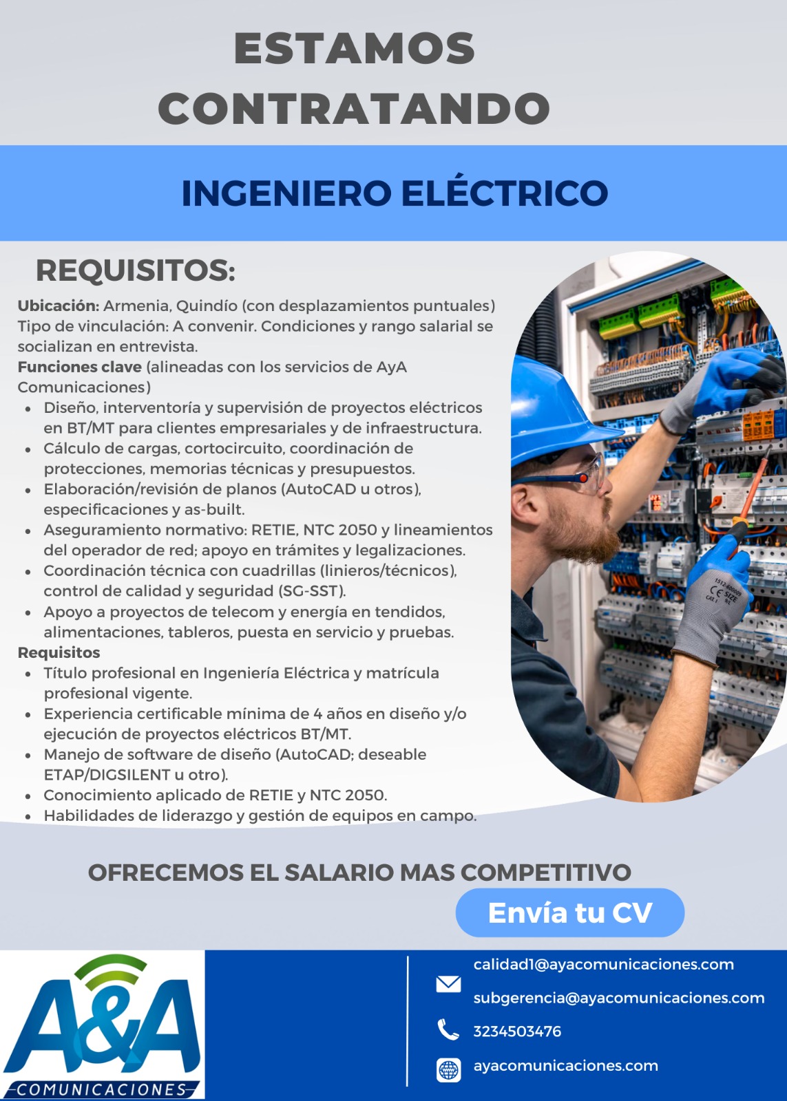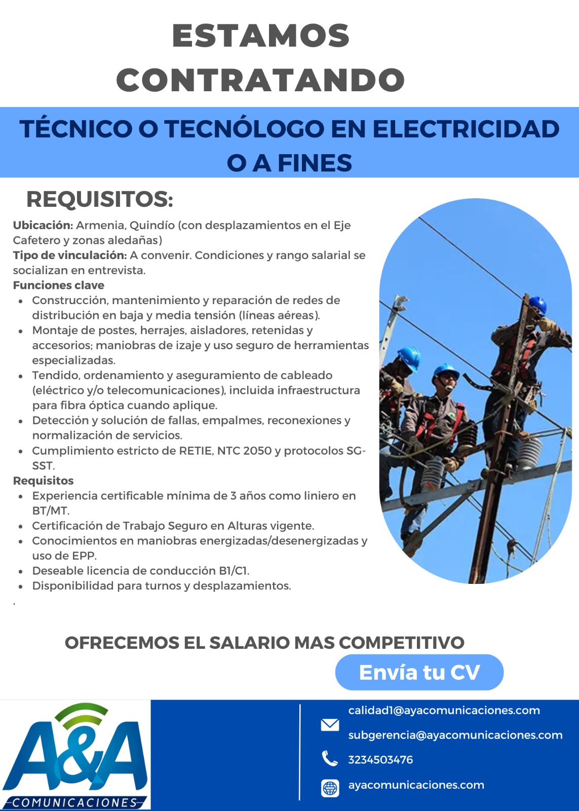 En A&A Radiocomunicaciones S.A.S. valoramos el talento, la innovación y el compromiso. Ofrecemos el salario más competitivo y un ambiente donde podrás desarrollarte profesionalmente mientras contribuyes al crecimiento tecnológico del país.